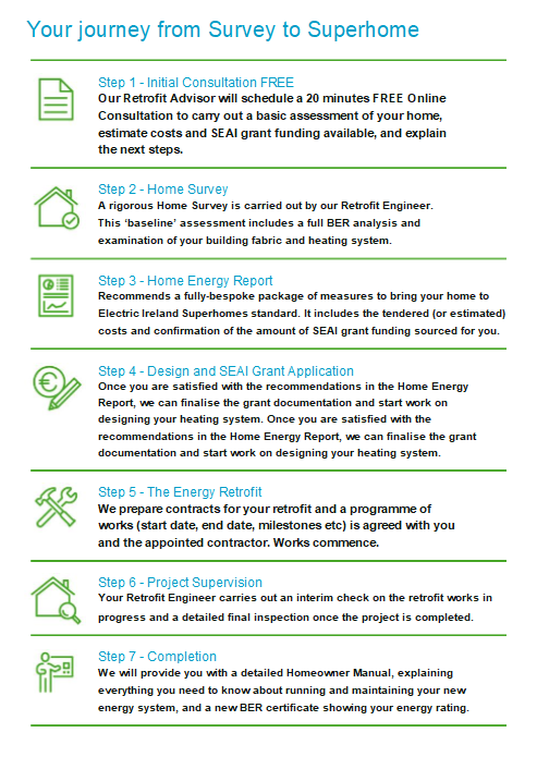 As a One Stop Shop, Electric Ireland Superhomes’ experienced team looks after all the key stages of a home energy retrofit, from retrofit design, through to contractor selection, project completion and management of SEAI grant funding. Our aim is to provide quality assurance, peace of mind, and, when the retrofit is complete, the best home possible.